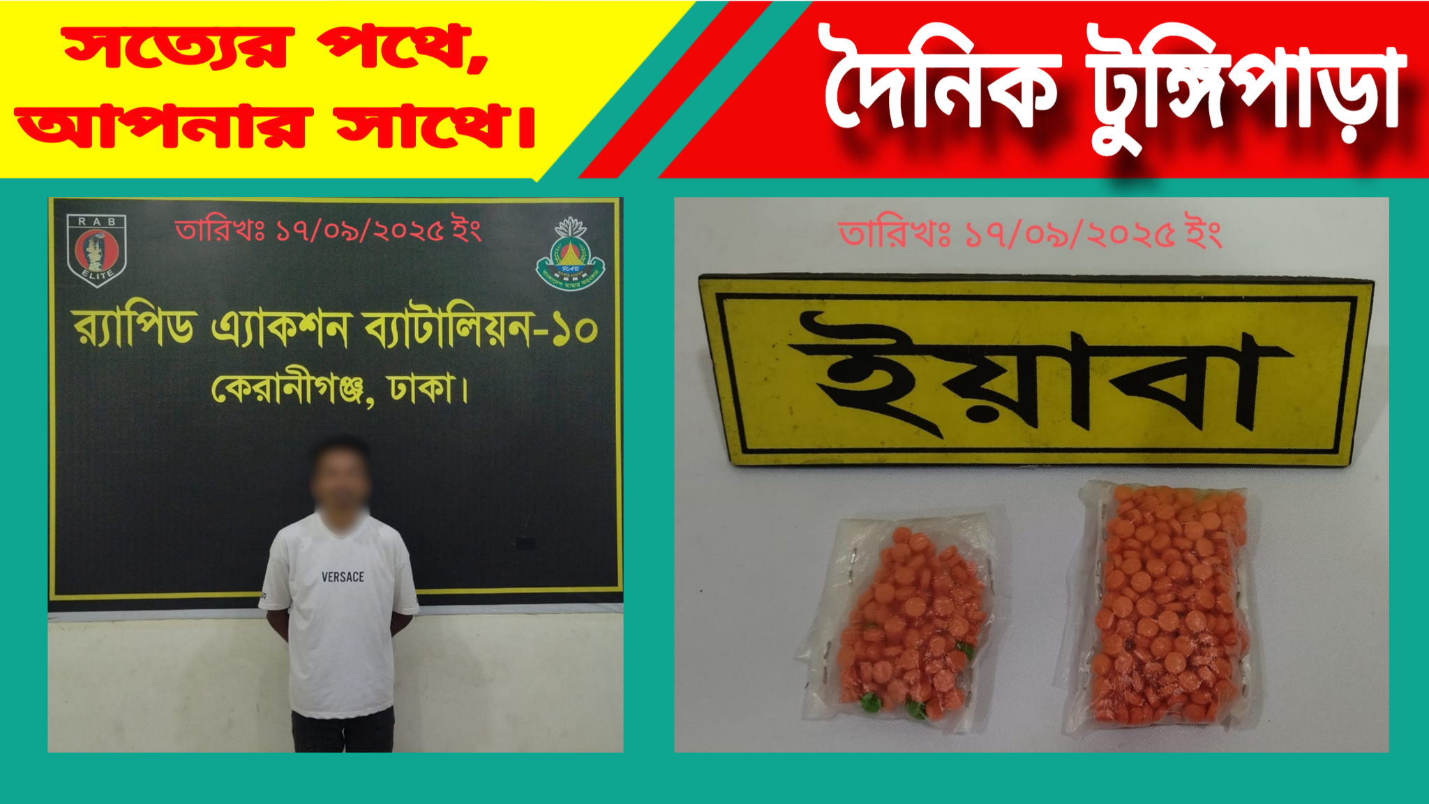 গতকাল ১৭/০৯/২০২৫ তারিখ রাত আনুমান ২১.৪৫ ঘটিকায় ডিএমপি, ঢাকার কদমতলী থানাধীন গোয়ালবাড়ী এলাকায় অভিযান চালিয়ে আনুমানিক ১,২৫,৭০০/- (এক লক্ষ পঁচিশ হাজার সাতশত) টাকা মূল্যমানের ৪১৯ (চারশত ঊনিশ) পিস ইয়াবাসহ ০১ জন মাদক ব্যবসায়ীকে গ্রেফতার করা হয়। গ্রেফতারকৃত মাদক ব্যবসায়ীর নাম মোঃ মনির (৩০), পিতা- আব্দুল মজিদ, সাং- পাটেরবাগ, থানা- কদমতলী, ডিএমপি, ঢাকা বলে জানা যায়।