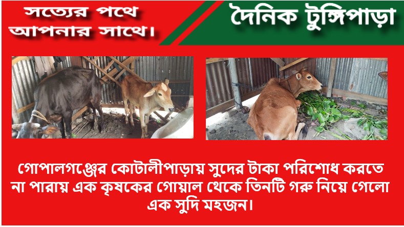 সেই টাকা গতকাল বুধবার রাতে আবুল হোসেন গাজী তার স্ত্রী - সন্তান নিয়ে বাড়ীতে এসে টাকার জন্য চাপ প্রয়োগ করে এবং অকথ্য ভাষায় গালা গাল করে, একপর্যায়ে ক্ষিপ্ত হয়ে সুদি টাকার জন্য দারিদ্র্য কৃষক আলতাফ হোসেন গাজীর গোয়াল ঘর থেকে একটি দুধের বাছুর ও দুটি বড় গরু নিয়ে যায় তার বাড়ীতে।